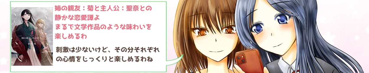 漫画(あ)姉の親友、私の恋人。 タイトル通り、主人公である聖奈が姉である優奈の親友であり元恋人であった菊と恋仲になっていくのが物語のメインテーマであり、百合要素。 2025.10.06 0漫画漫画百合的感想 あ~お行