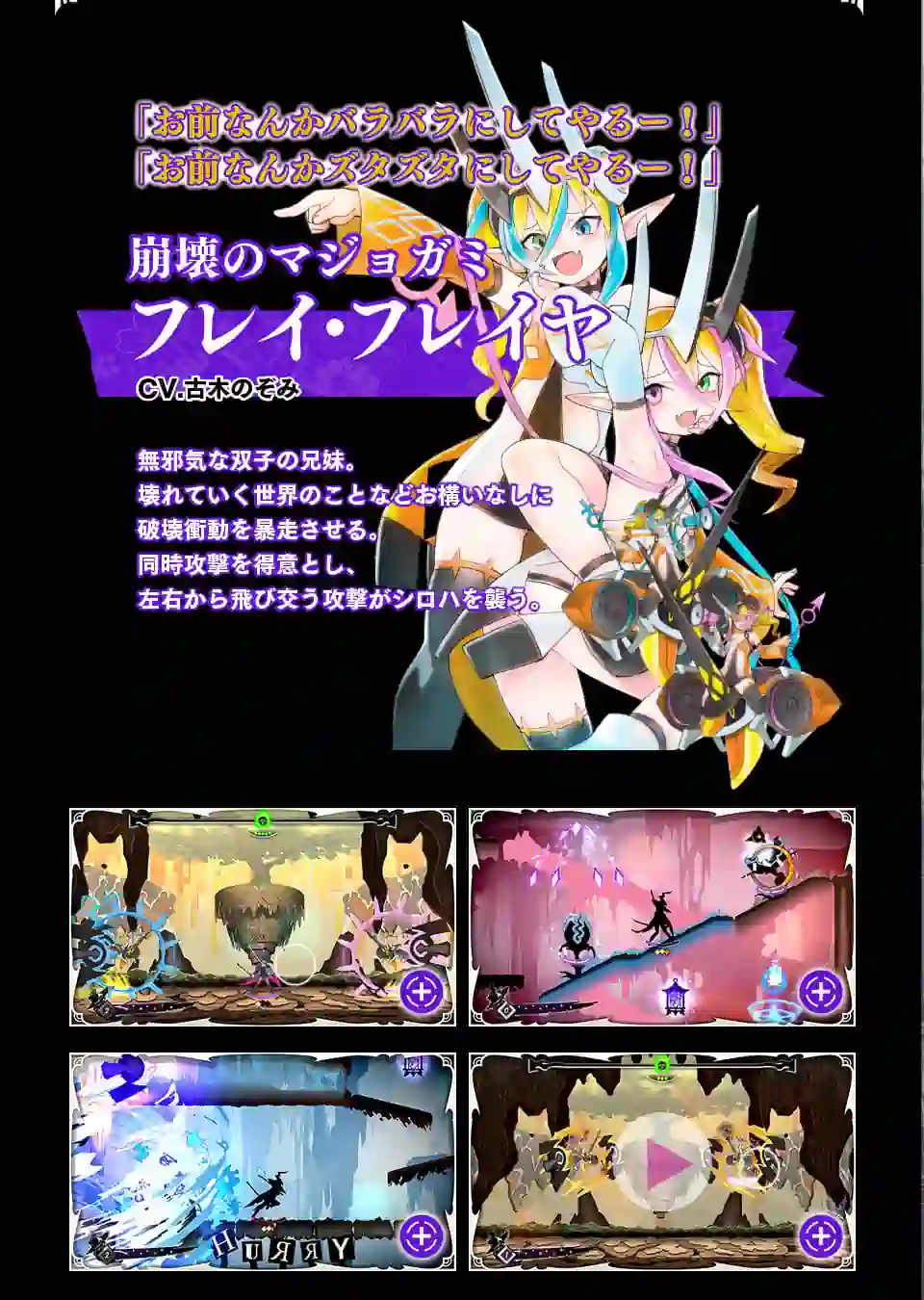 キャラについてはボスキャラについての情報ですね。他のボスキャラと同じく女性ばかり-フレイ・フレイヤは”双子の兄妹”とされていますが(汗)-なので、シロハとの関係次第では百合的に楽しめるかも、ですが・・・ボス=敵対関係なので、そこは微妙な所ですね(苦笑)