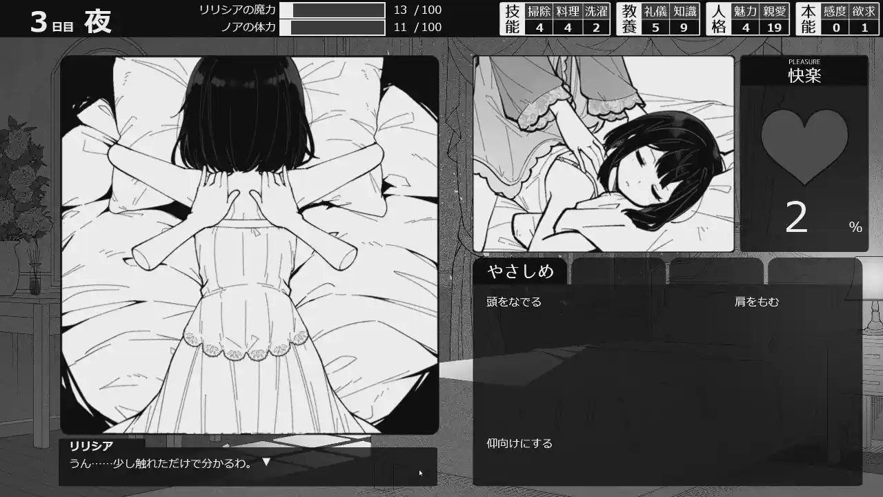 またノアが色を取り戻すためにリリシアが魔力を流し込む”マッサージ”を行う・・・最終的にはこのパートが成人向けシーンとなると思われますが、このパートも終始穏やかで優しい雰囲気で甘いです。