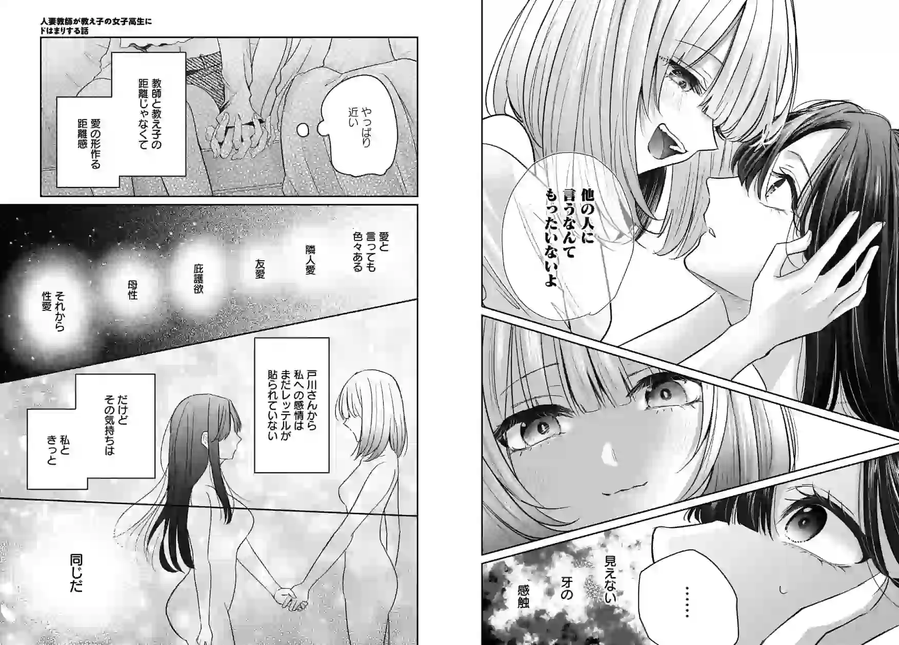 人妻と女子高生(教え子)との恋愛、というかなり踏み込んだ関係性を描いた百合小説のコミカライズ版ですね。