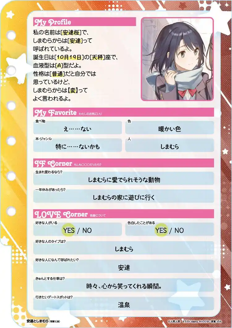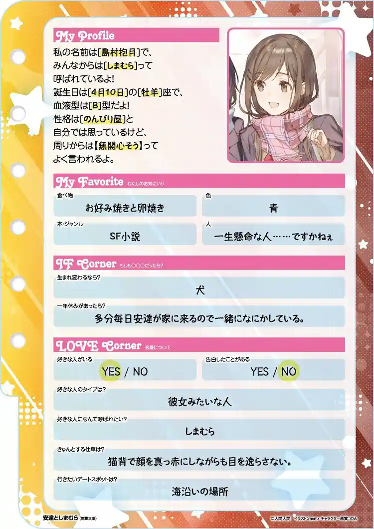 いや、だってこの内容だったら「安達としまむら」では日野&永藤、「転生王女と天才令嬢の魔法革命」ではイリア&レイニの、といった具合にプロフィールみたくない? 少なくとも管理人は見たい!