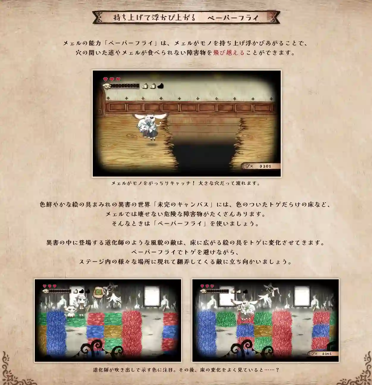 - ペーパーフライ:メェルがモノを持ち上げ浮かびあがり、障害物などを飛び越えたりできる