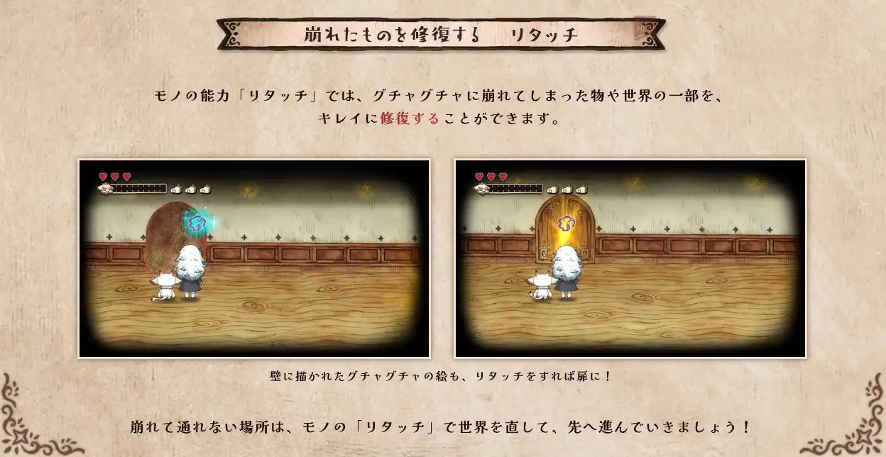 - リタッチ:文字通り、世界の一部や壊れた物を修復する